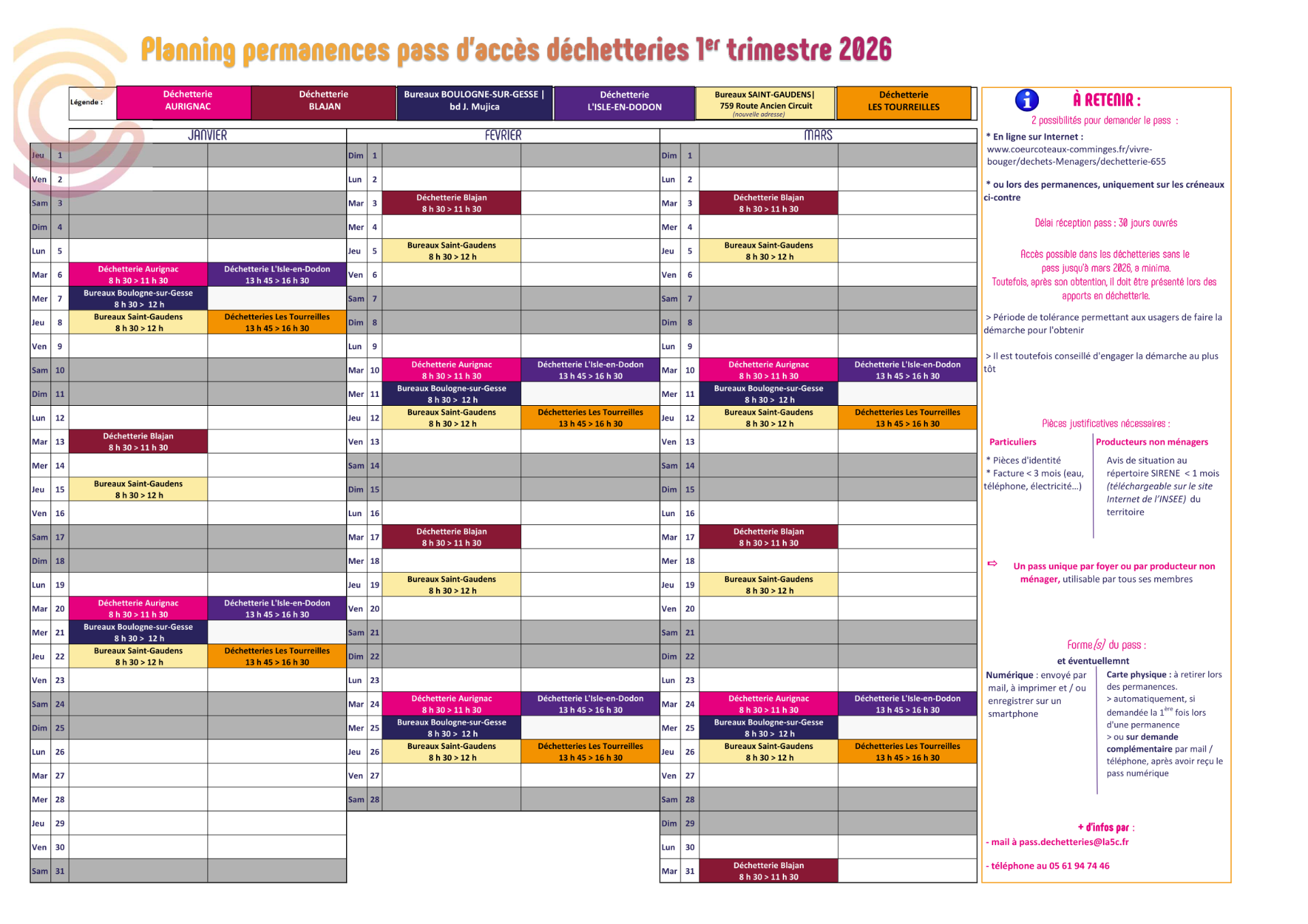 - Planning 1er TRIMESTRE 2026 demande de PASS d'accès en déchetterie